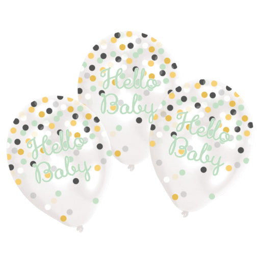 Vollständige Details anzeigen"Hello Baby" Latexballons 6 Stück 11" | Transparent mit Konfetti