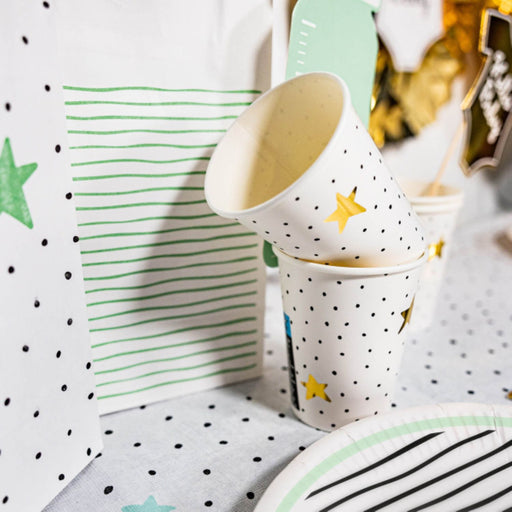 Die Dekoserie âHello Babyâ bringt modernen Stil in Deine Babyparty! Mit einer klaren, eleganten Farbpalette aus Weiß, Grün, Gold und Schwarz un...