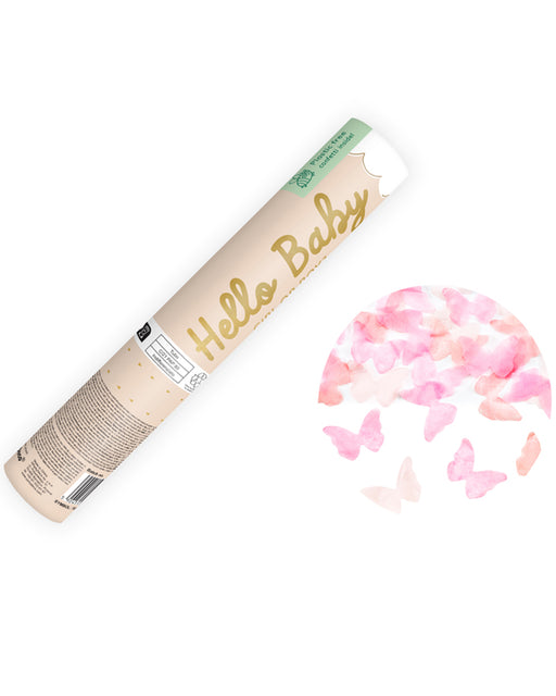 Vollständige Details anzeigenKonfetti Kanone "Hello Baby" 20 cm | Rosa Schmetterlinge