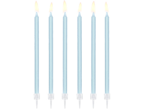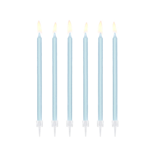 Glatte Geburtstagskerzen in Hellblau, ca. 14 cm hoch. Das Set enthält 12 Kerzen und Untersetzer.