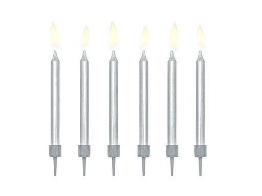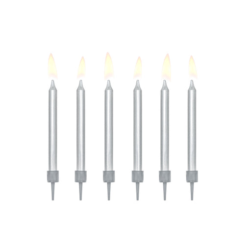 Glatte Geburtstagskerzen in Silber-Metallic, ca. 6 cm groß, Set mit 6 Kerzen und 6 Halter.