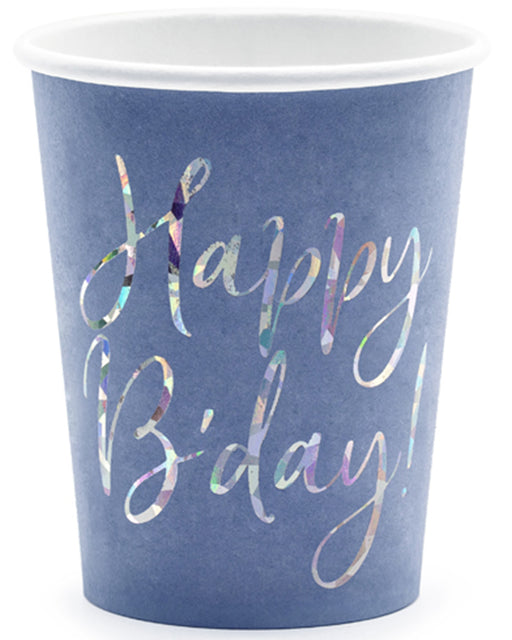 Marineblaue Pappbecher mit holografischer Aufschrift "Happy B'day!". Fassungsvermögen ca. 220 ml. Eine tolle Tischdecko für den Geburtstag.