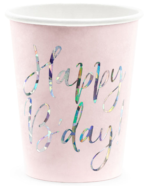 Hell-Puderrosa Pappbecher mit holografischer Aufschrift "Happy B'day!". Fassungsvermögen ca. 220 ml. Eine tolle Tischdecko für den Geburtstag.