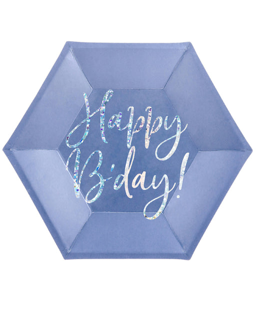 Marineblaue Pappteller mit holografischer Aufschrift "Happy B'day!". Eine tolle Tischdecko für den Geburtstag. Die 6 Teller haben jeweils einen Dur...