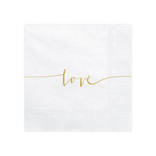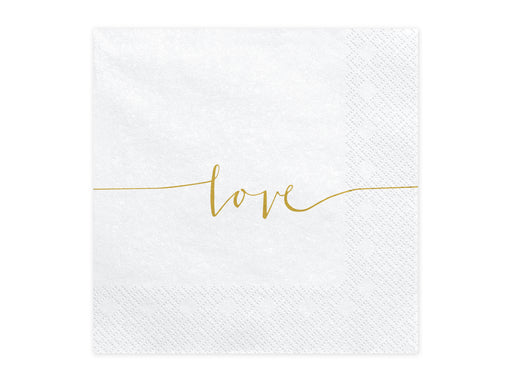 Elegante Papierservietten in Weiß mit goldener „Love“-Aufschrift – perfekt für Hochzeiten, Verlobungen oder romantische Feiern. Die Servietten habe...