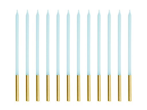 Glatte Geburtstagskerzen in Hellblau, ca. 14 cm hoch. Das Set enthält 12 Kerzen.
