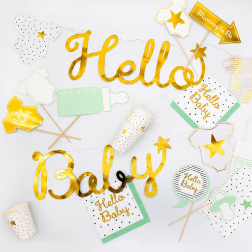Die Dekoserie âHello Babyâ bringt modernen Stil in Deine Babyparty! Mit einer klaren, eleganten Farbpalette aus Weiß, Grün, Gold und Schwarz un...