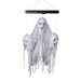 Diese Halloween-Dekoration besteht aus drei schwebenden Köpfen, die für eine gespenstische Atmosphäre sorgen. Die Köpfe hängen an einer Stange und bewegen sich unheimlich auf und ab, als würden sie in der Luft schweben. Jeder Kopf hat ein furchterregendes Gesicht mit weit aufgerissenen Mündern, als ob sie in einem stummen Schrei verharren, und tief liegende, dunkle Augenhöhlen, die einen kalten, gruseligen Ausdruck erzeugen.